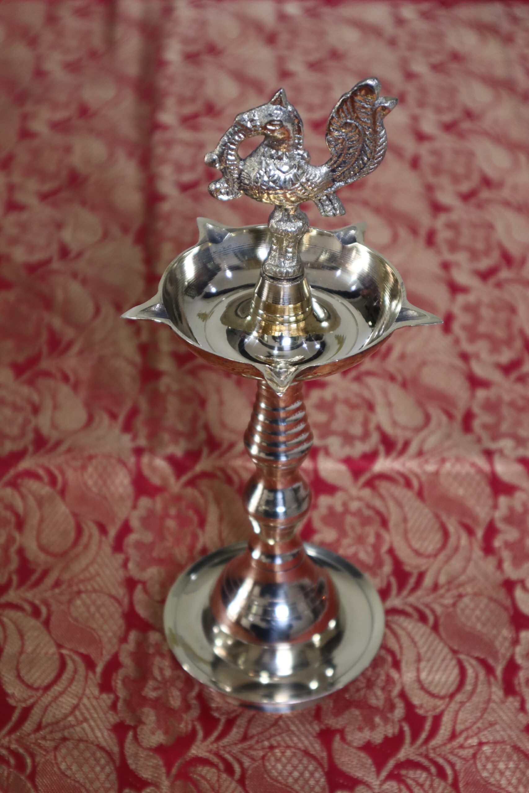 Bring home the timeless elegance of Indian tradition with this premium Brass Peacock Deepam Stand. Meticulously handcrafted by skilled artisans, this lamp features a beautifully detailed peacock (symbolizing grace and beauty) perched on a sturdy pillar, with a traditional 5-petaled diya base designed for burning oil or ghee.